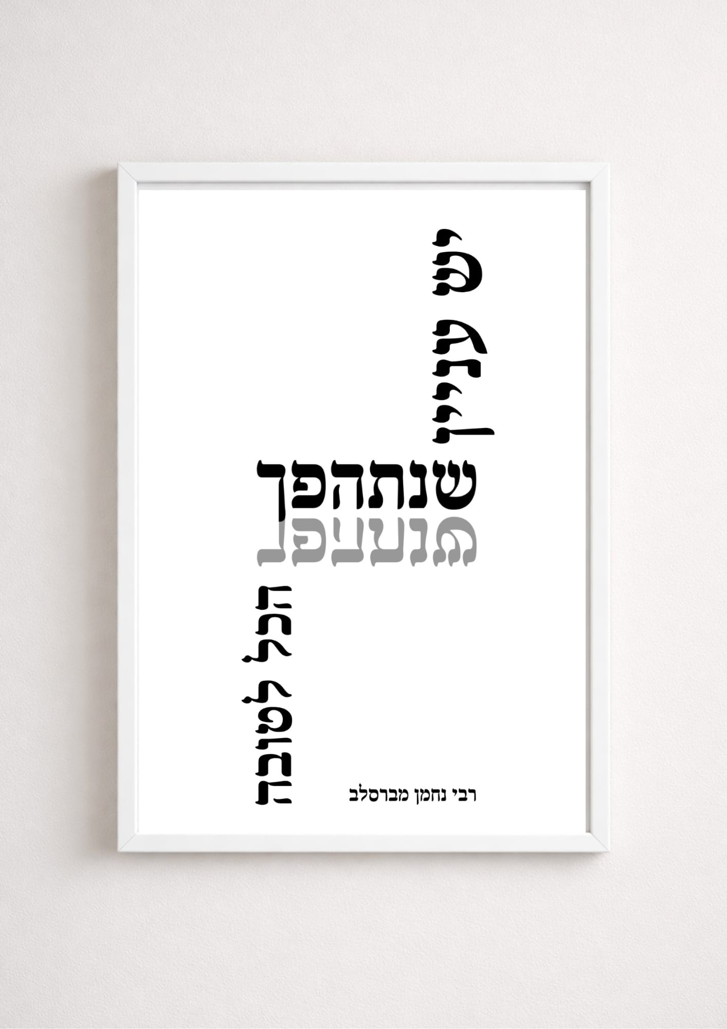 תמונת קיר מינימליסטית בגוון נקי ובהדפס 'יש עיין שנתהפך הכל לטובה' בגוון שחור על רקע בהיר, מעניקה לחלל מראה רגוע, אלגנטי ומלא משמעות. העיצוב הפשוט והמדויק מאפשר למילים להיות במרכז – ולהכניס הביתה השראה, אמונה וחיבור למסורת.