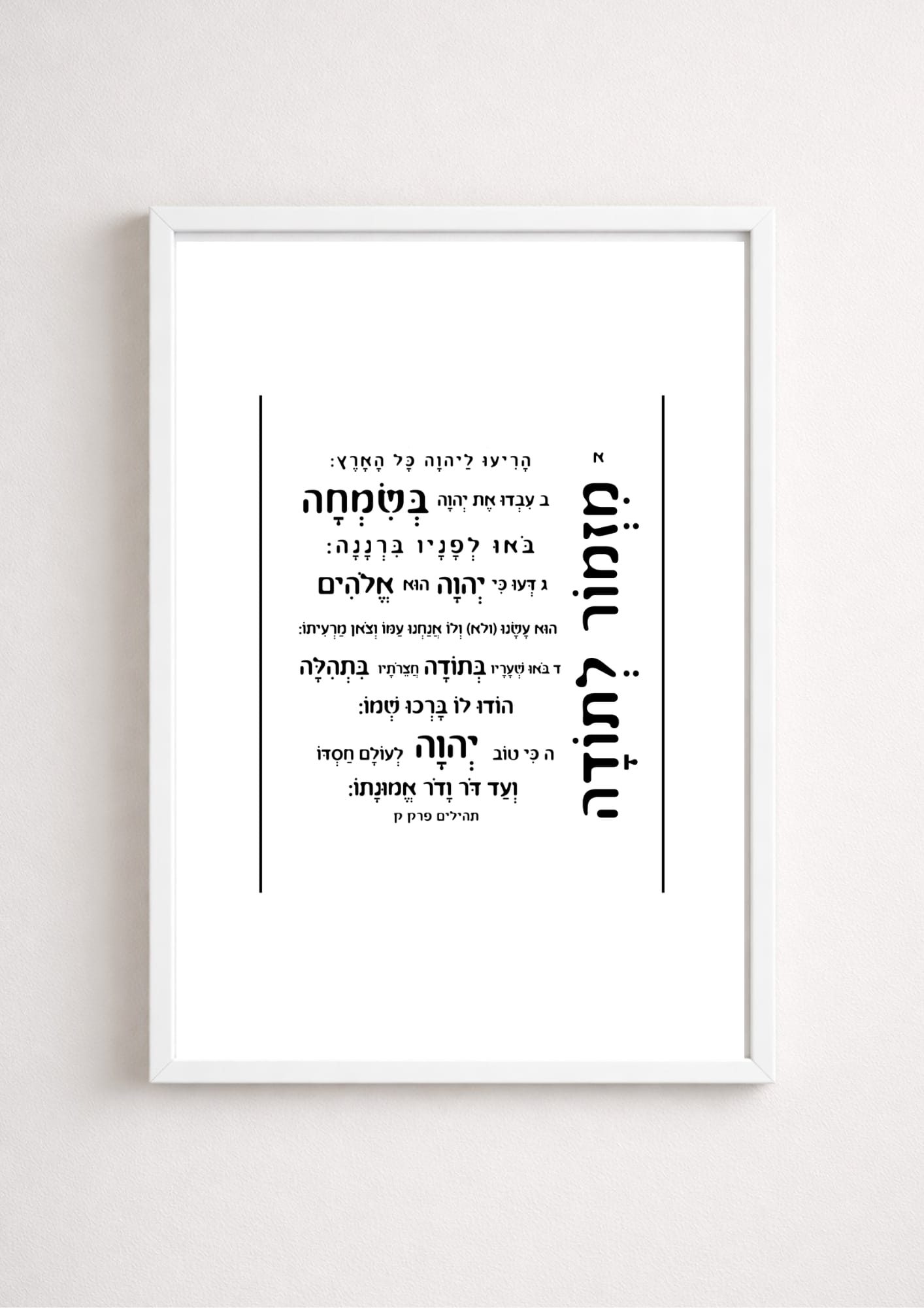 תמונת קיר מינימליסטית בגוון נקי ובהדפס 'מזמור לתודה' בגוון שחור על רקע בהיר, מעניקה לחלל מראה רגוע, אלגנטי ומלא משמעות. העיצוב הפשוט והמדויק מאפשר למילים להיות במרכז – ולהכניס הביתה השראה, אמונה וחיבור למסורת.