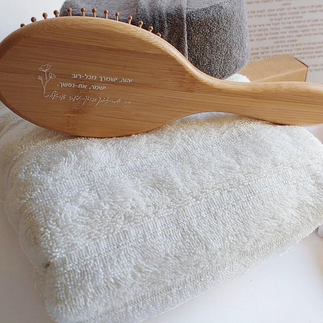 ספוג רך ונעים למגע, מברשת במבוק שגם עליה ברכה אישית לשמירה והגנה.