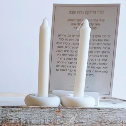 צמד פמוטי בטון, עם נרות, מעמד בטון וברכת הדלקת נרות.