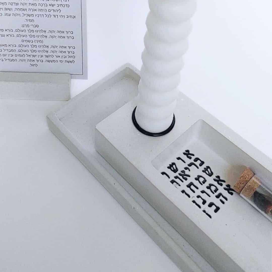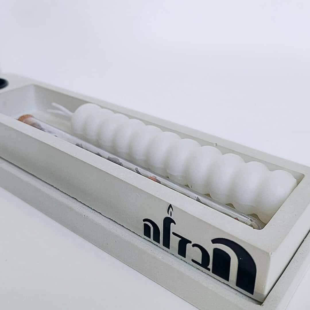 מארז הבדלה בעבודת יד, מושלם ומוכן לשימוש, כולל מגש בטון מלבני, תיבת בטון ובה מקום לנר הבדלה ומבחנת מיני בשמים, מעמד בטון וברכת הבדלה.