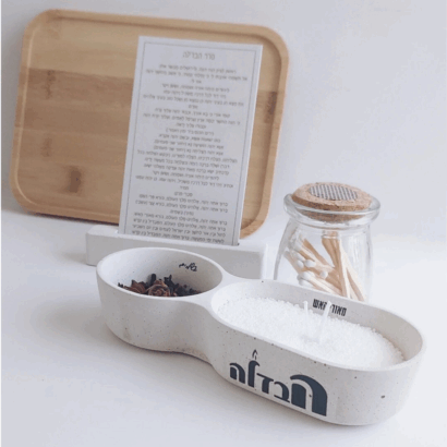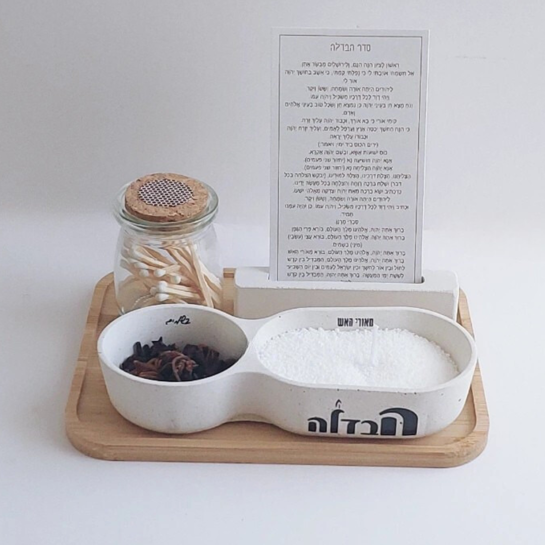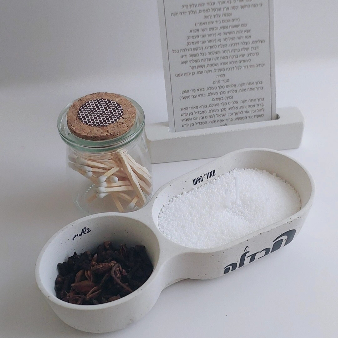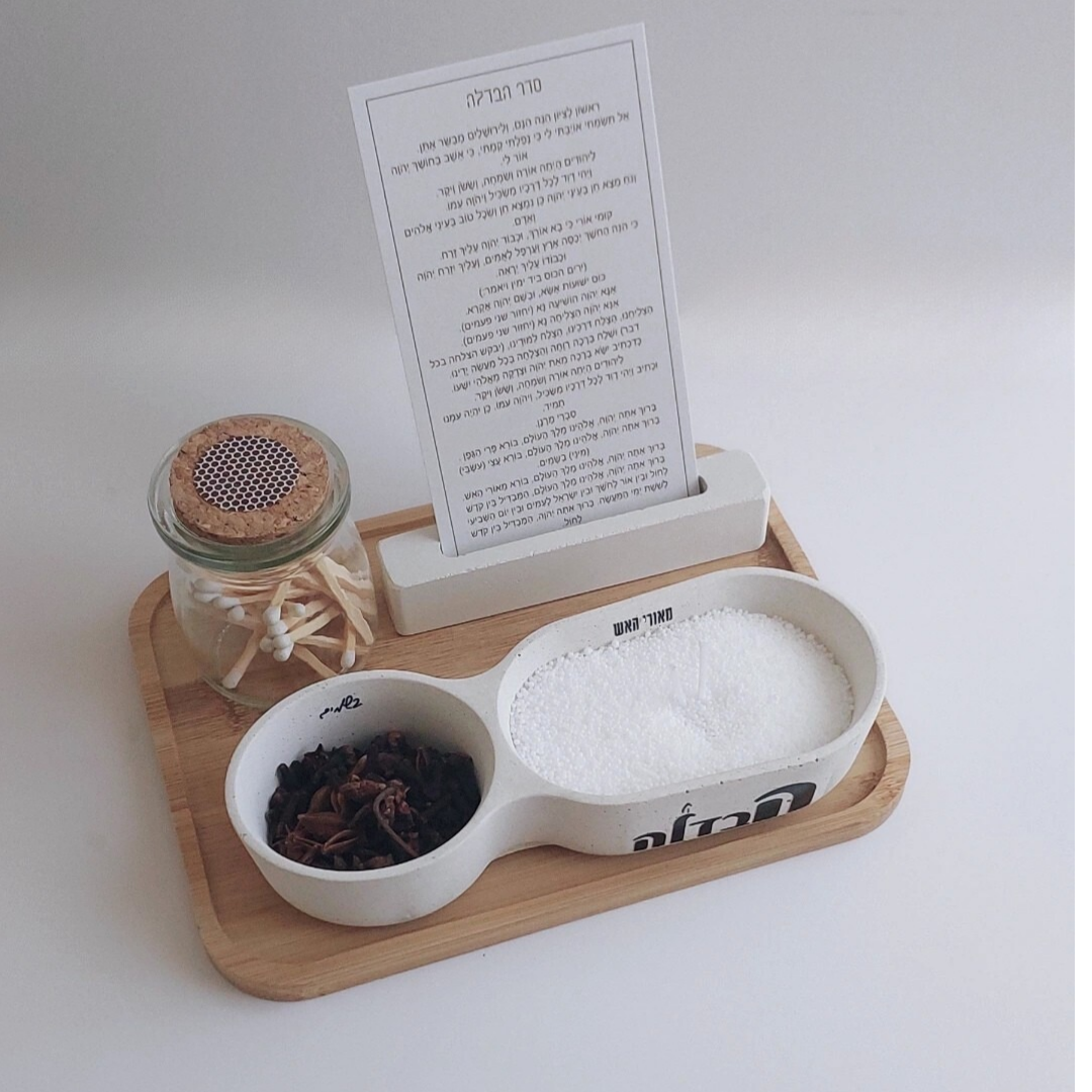 מגש עץ מהודר, כלי בטון מעוצב למיני בשמים, פתיתי שעווה עם פתיליות, צנצנת זכוכית עם גפרורים ומדבקת הדלקה, ומעמד בטון לברכת ההבדלה על קלף.