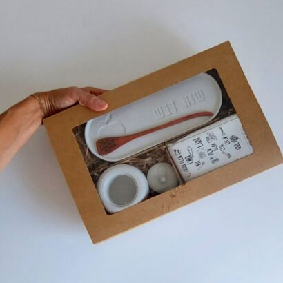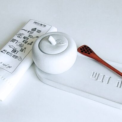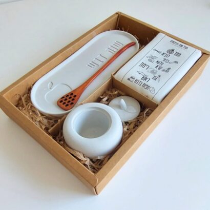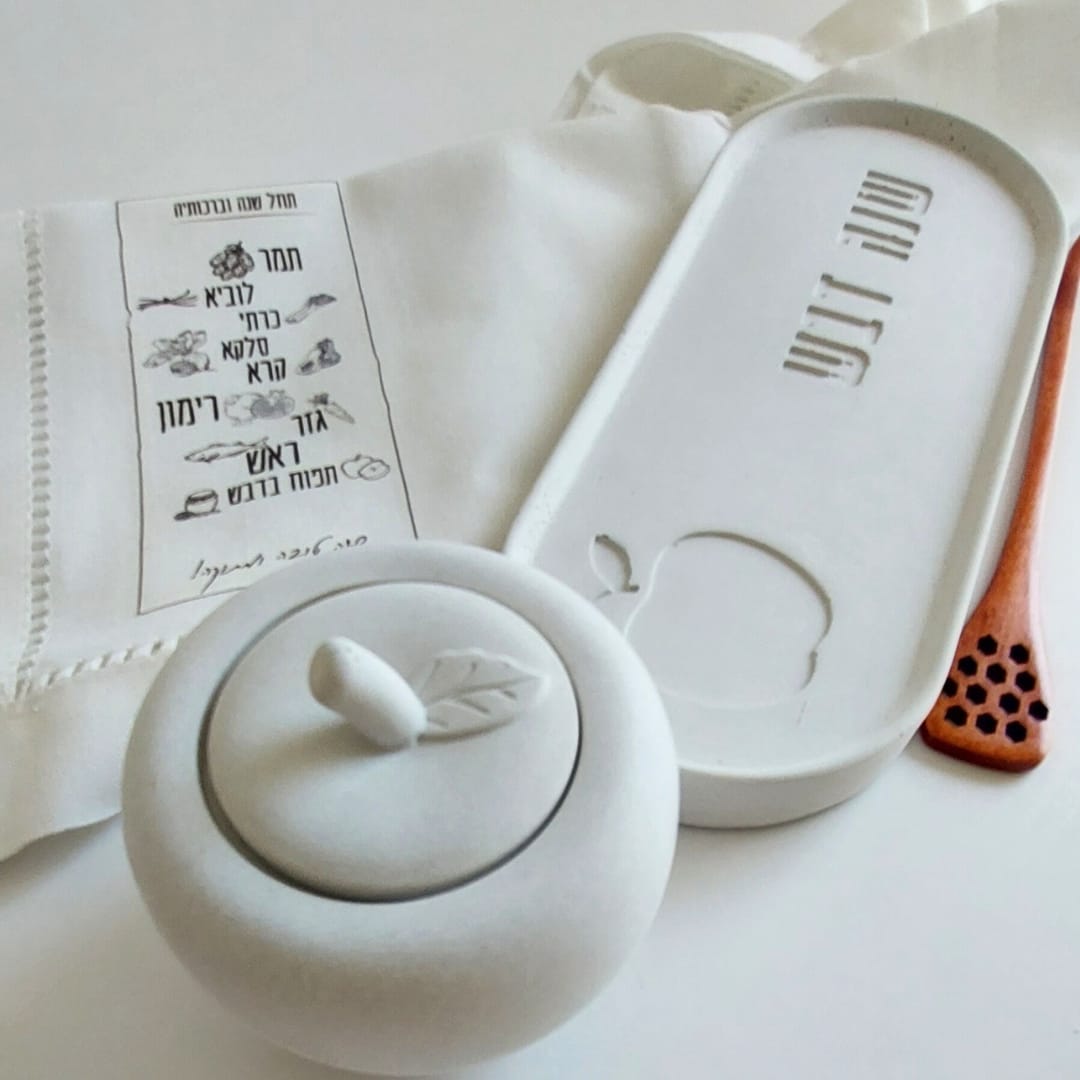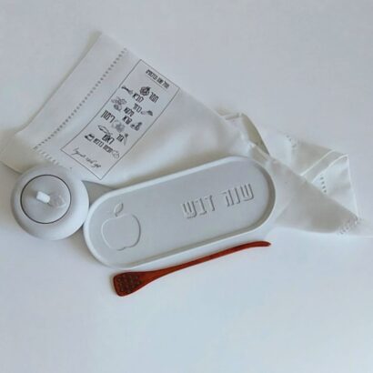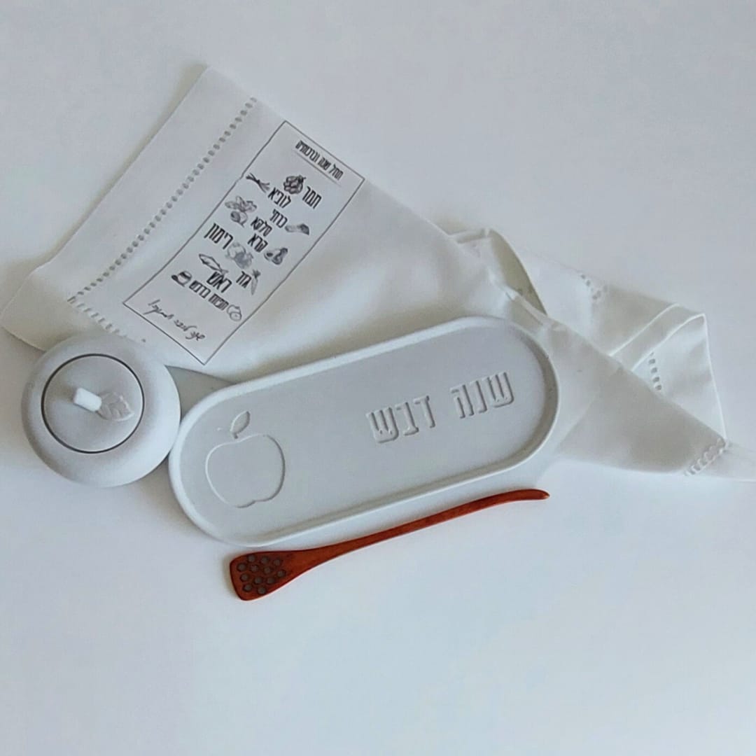 מארז 'שנה חדשה' כולל בתוכו מגש אובלי עם הכיתוב "שנה דבש", כיסוי לברכות החג עם כל הברכות עליו, כלי בטון עם מכסה ומקלון לדבש.