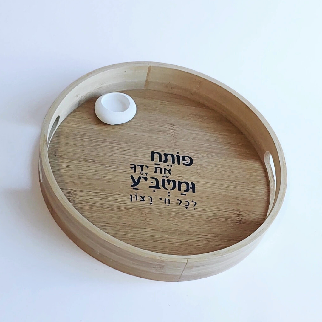 מגש במבוק עגול לשולחן השבת, עם הכיתוב "פותח את ידיך ומשביע לכל חי רצון". קוטר: 30 ס"מ.