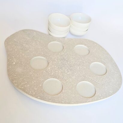 הצלחת מגיעה בגוון אבן וניתן להתאים לה צלוחיות בגוונים: לבן, שחור, זהב ( יש לציין את הגוו הנבחר בהערות ההזמנה )