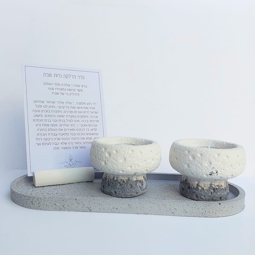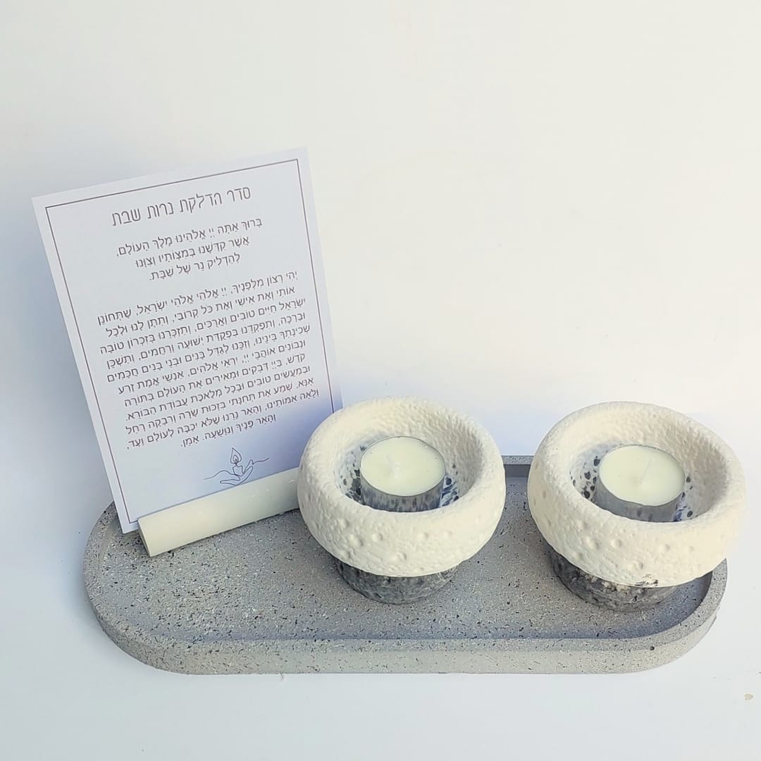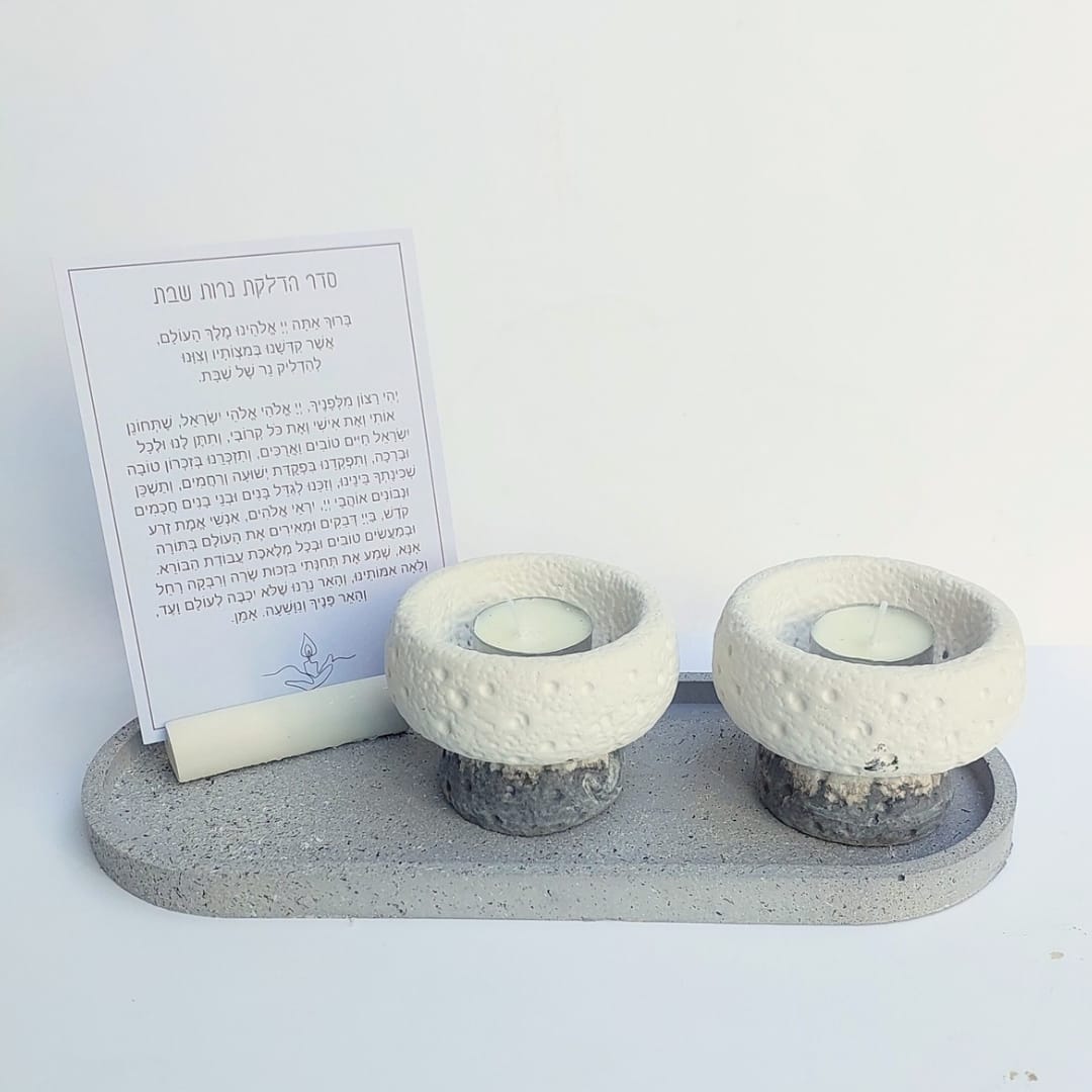 הסט מגיע עם מגש בטון אובלי מחוספס בגוון גרניט, צמד פמוטי בטון משולבים 2 גוונים בטקסטורת אבן, מעמד בטון עם ברכת הדלקת נרות על קלף.