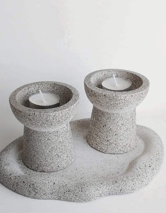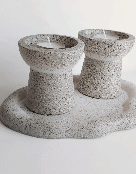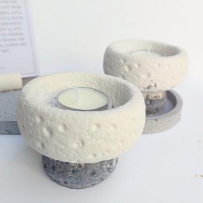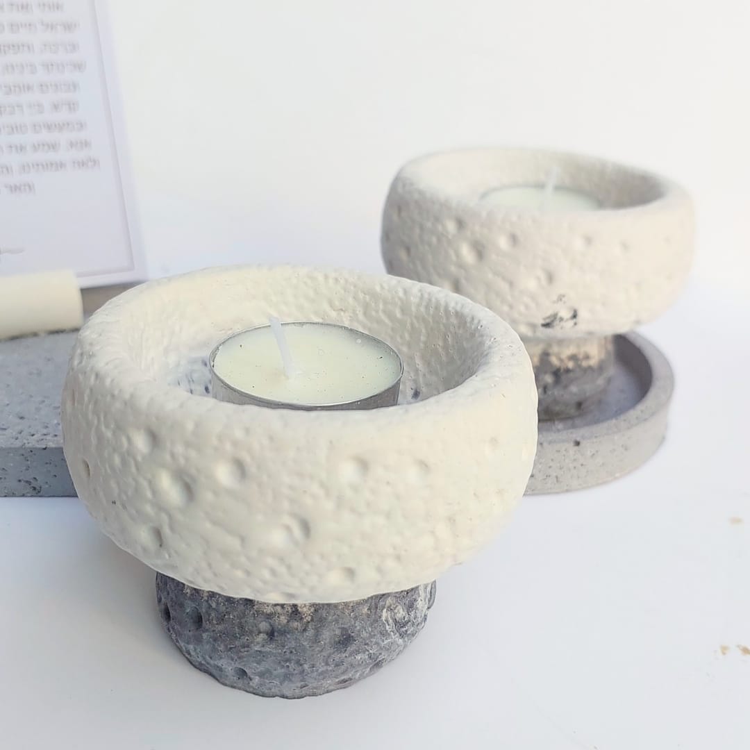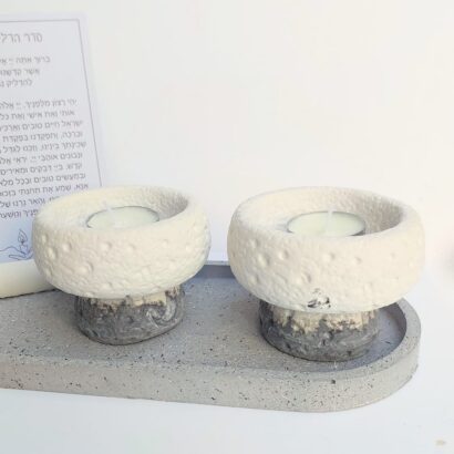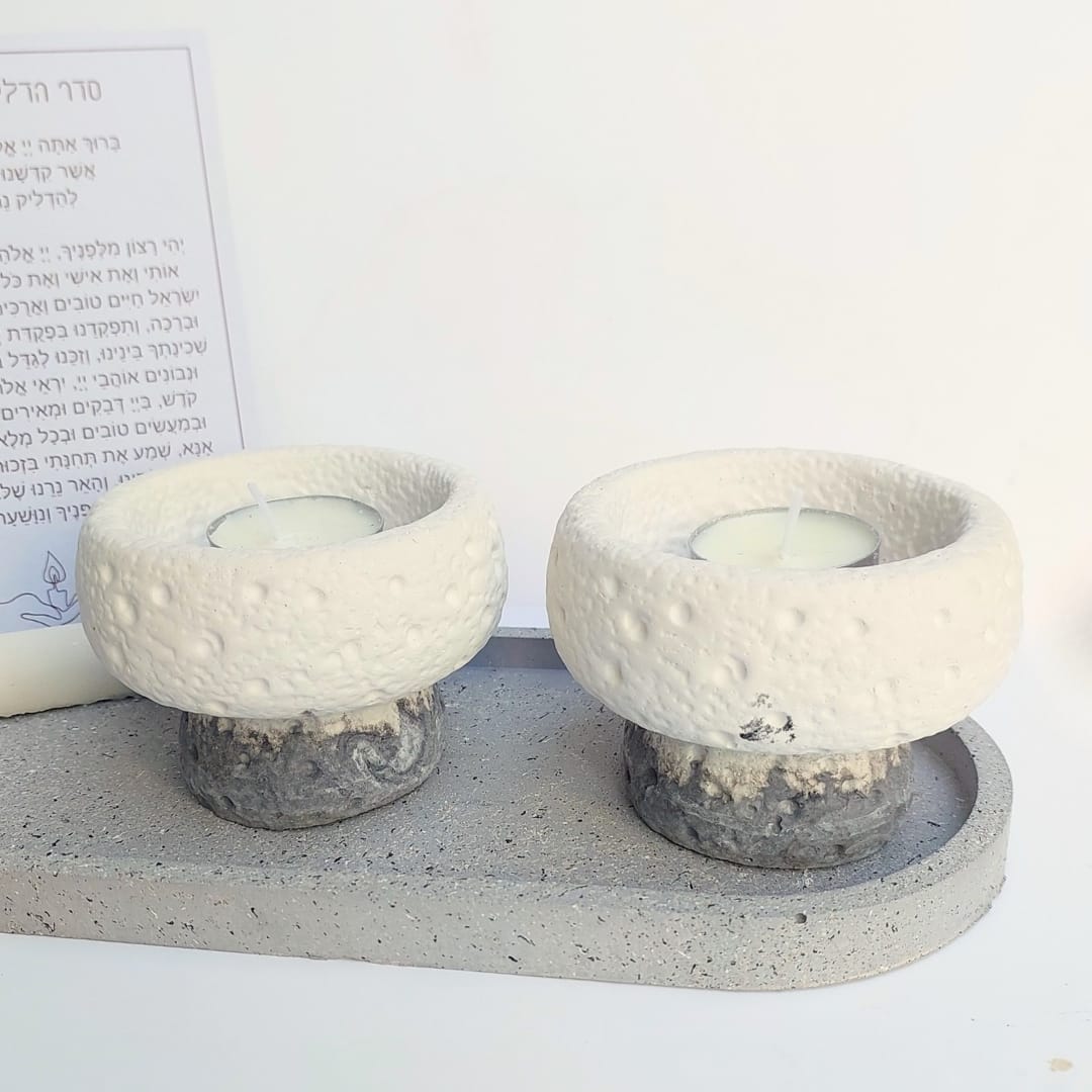 הסט מגיע עם מגש בטון אובלי מחוספס בגוון גרניט, צמד פמוטי בטון משולבים 2 גוונים בטקסטורת אבן, מעמד בטון עם ברכת הדלקת נרות על קלף.