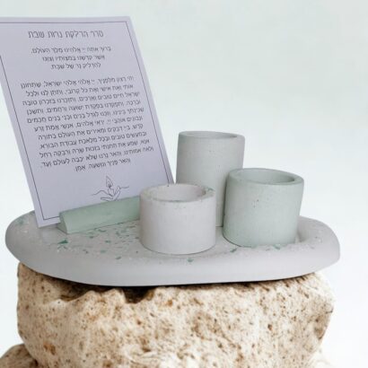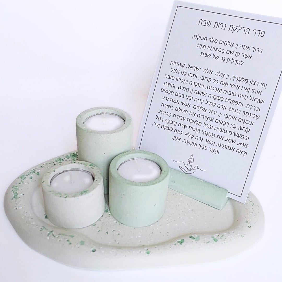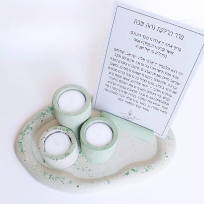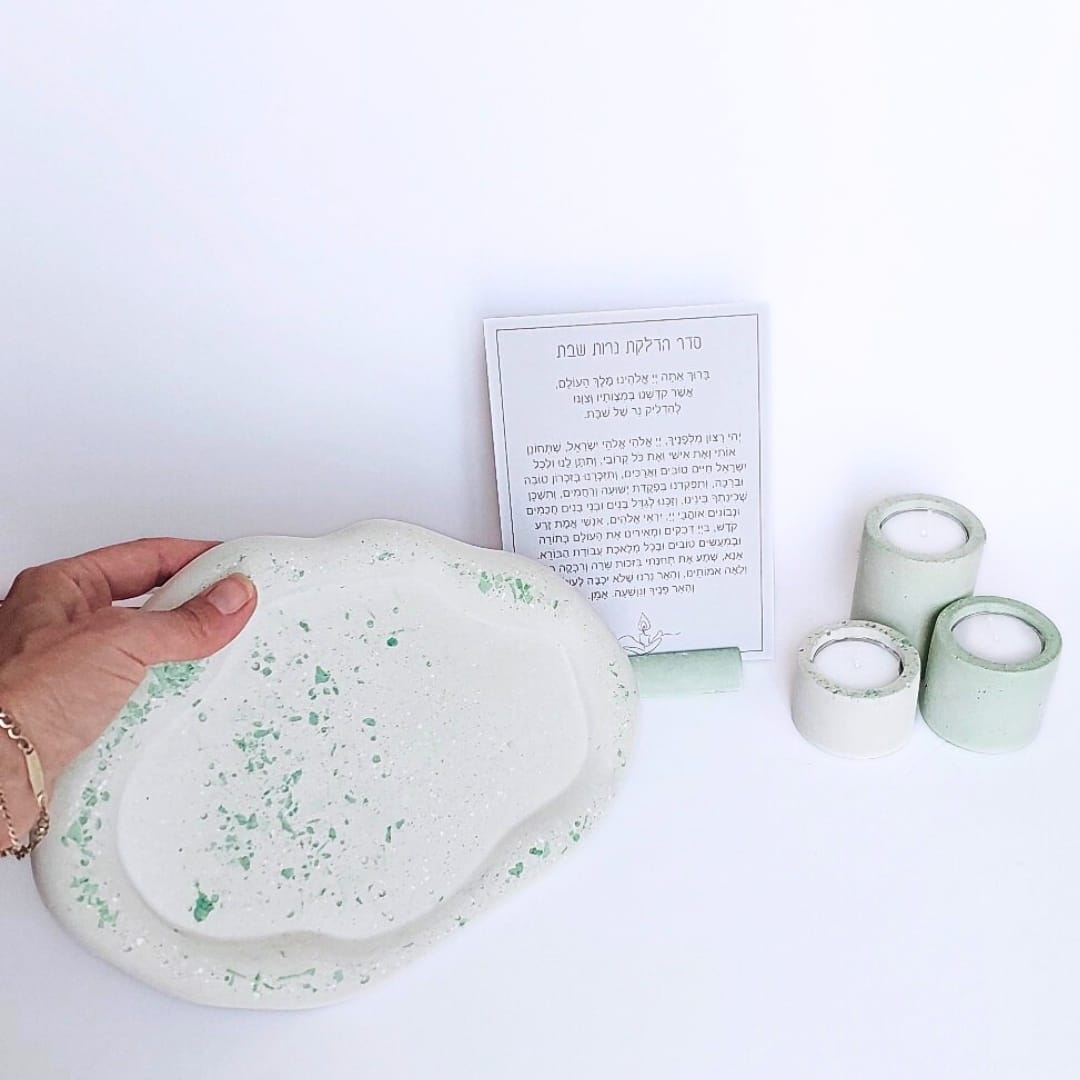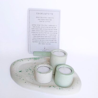 הכנתי עבורכן סט מגש, מעמד הדלקת נרות ו 3 פמוטים לשבת, בגוונים של ירוק, עשויים בטון בטכניקת טרצו, לא מעובד, מחוספס ומבוקע, כמו הליכה בתוך שדה, עם שינוי של גוונים וטקסטורות..