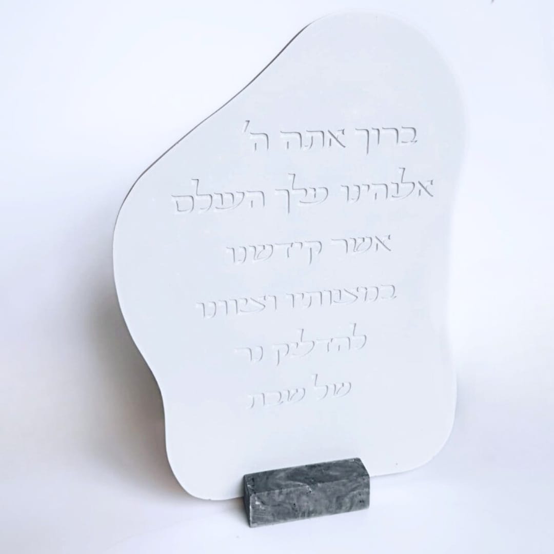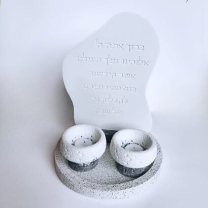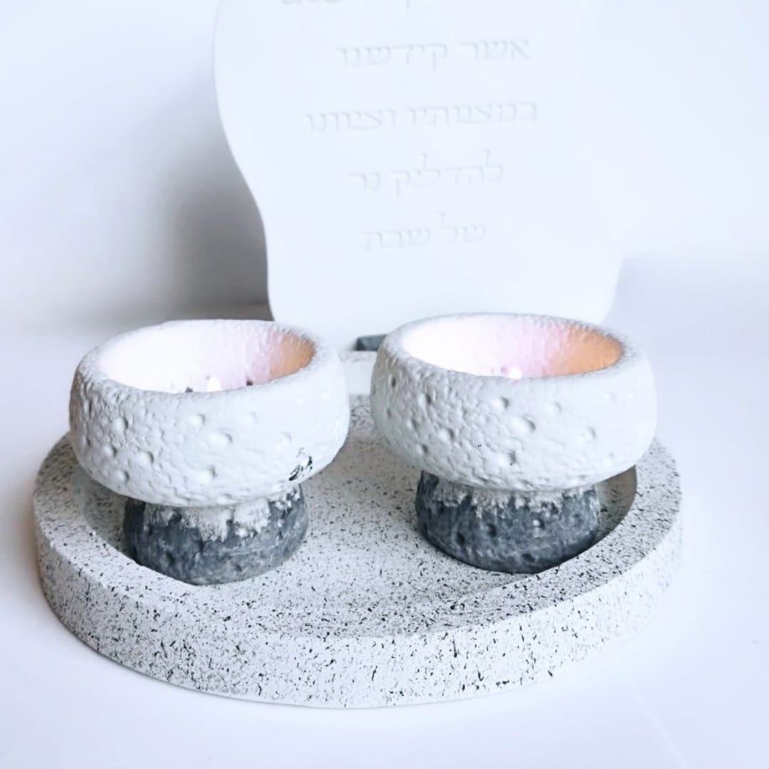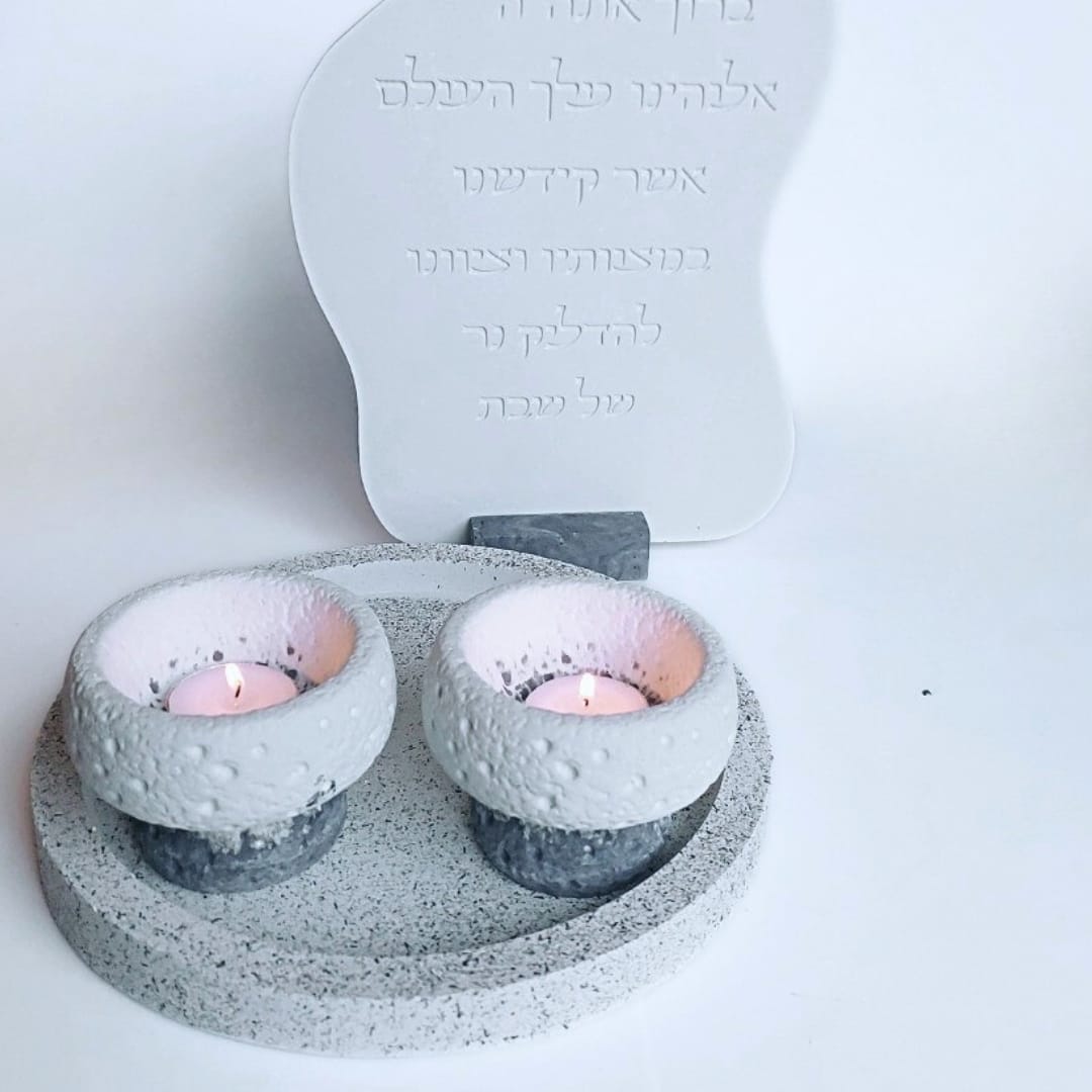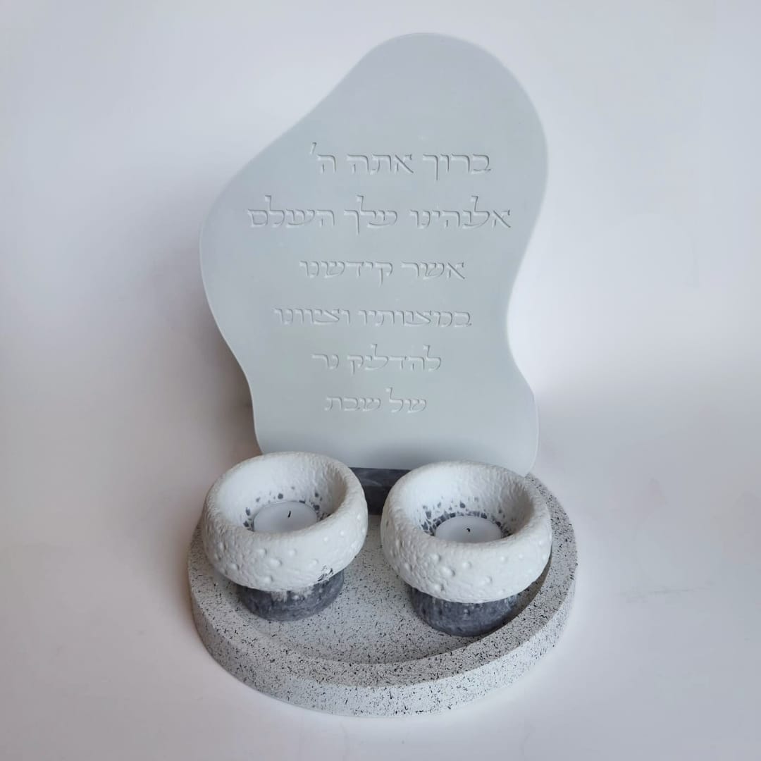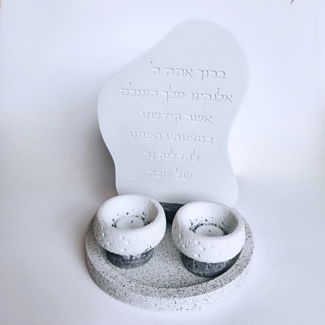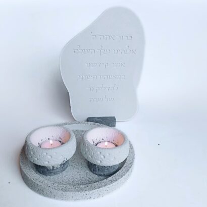 הסט מגיע עם מגש בטון עגול מחוספס בגוון גרניט, צמד פמוטי בטון משולבים 2 גוונים בטקסטורת אבן, מעמד בטון עם לוח בטון שעליו חרוטה ברכת הדלקת הנרות.
