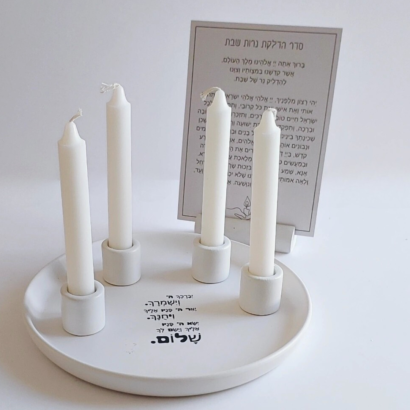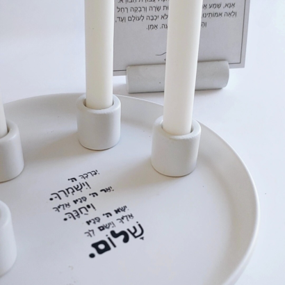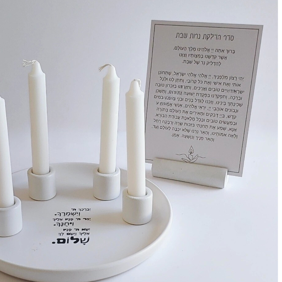 המארז מגיע עם קלף ברכת הדלקת נרות ומעמד בטון.